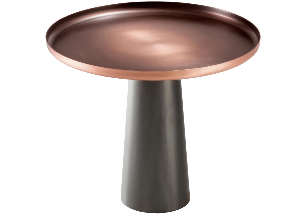 Sunset designed by Artefatto for DeCastelli is a round coffee table in brass or copper, with tray-shaped top and conical base. Available in different finishes.