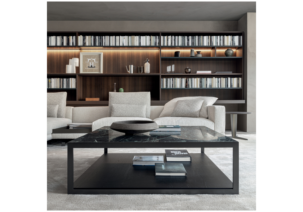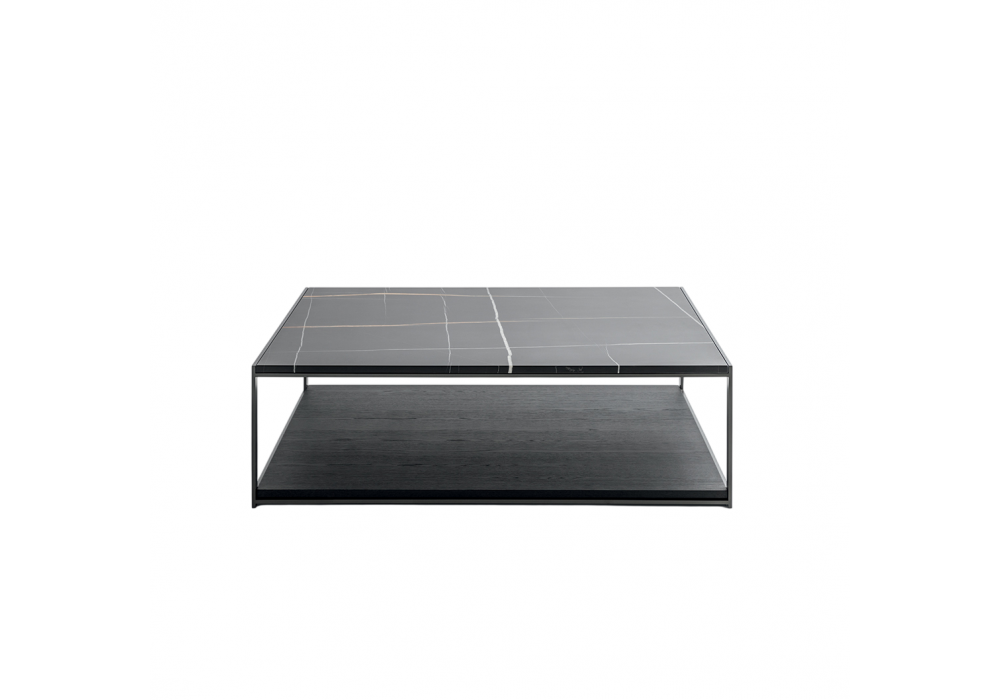 Alisee designed by Matteo Nunziati for Molteni&C is a coffee table with a wooden lower shelf, a marble, glass, or wood upper shelf, and a matte pewter metal frame. Available in different finishes and dimensions.