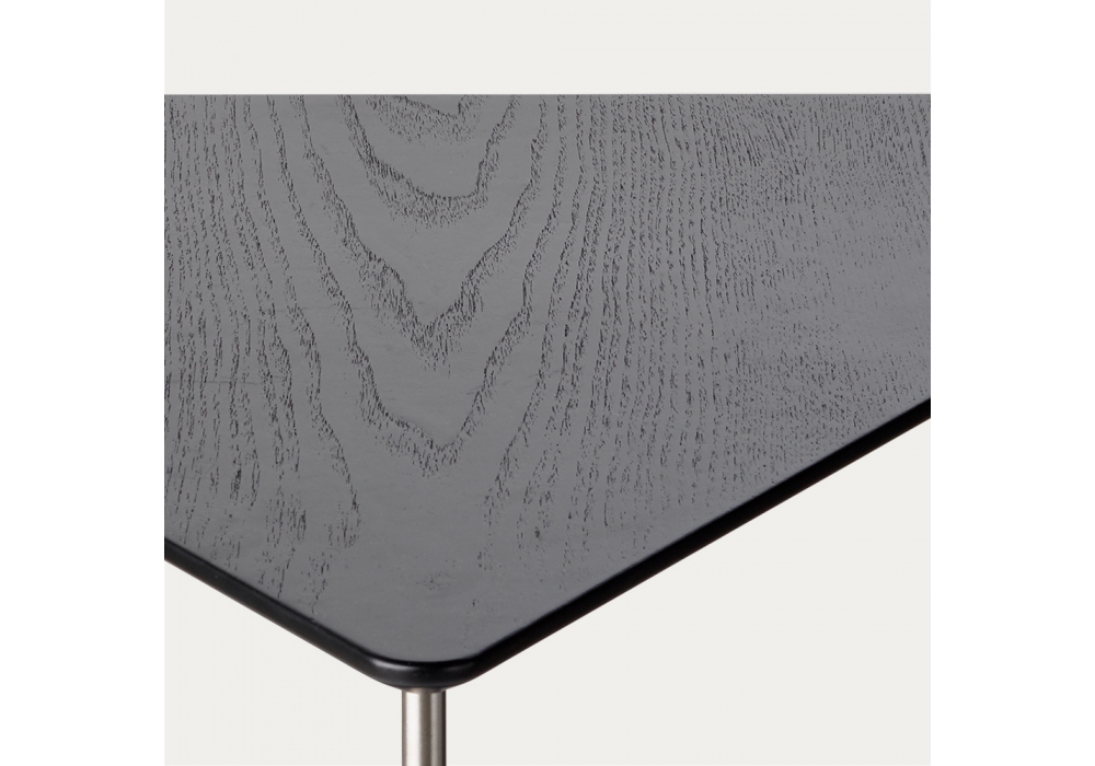 AJ Trolley designed by Arne Jacobsen for Fritz Hansen is a small table with triangular table tops in black coloured ash. The frame is made of brushed stainless steel and comes with the castors in metal.