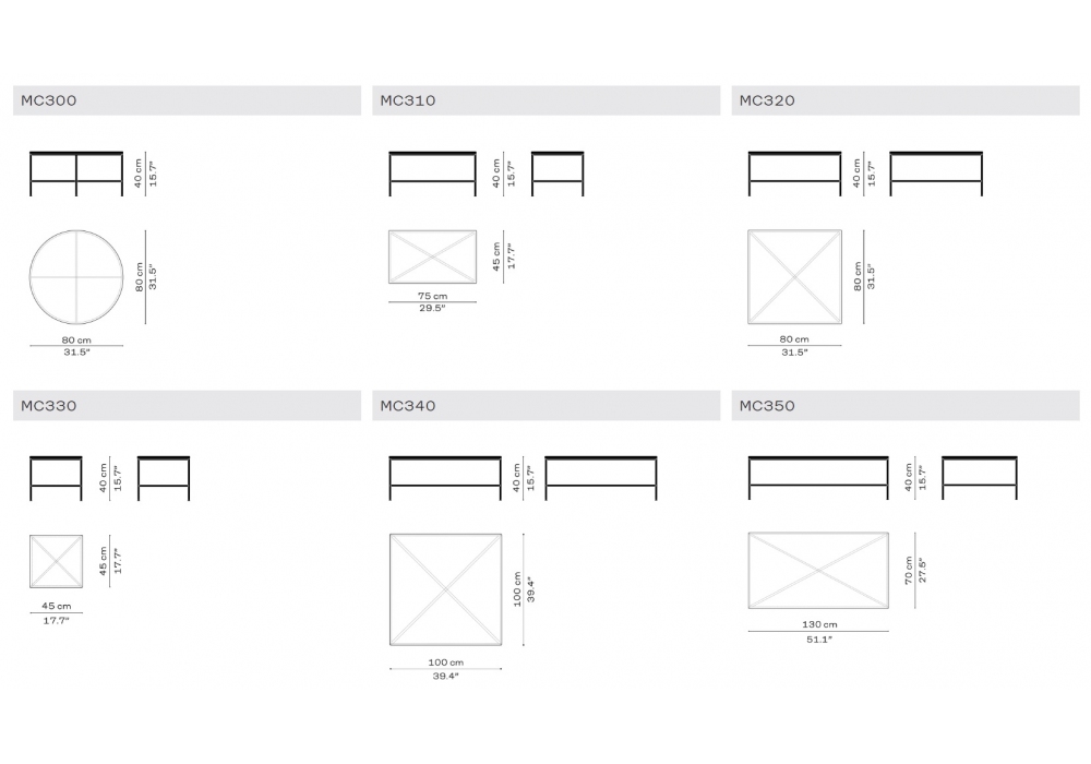 | Dimensions | Ø 80 x H 40 cm; 75 x 45 x H 40 cm; 80 x 80 x H 40 cm; 45 x 45 x H 40 cm; 100 x 100 x H 40 cm; 130 x 70 x H 40 cm. |