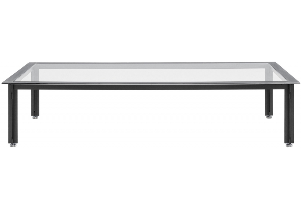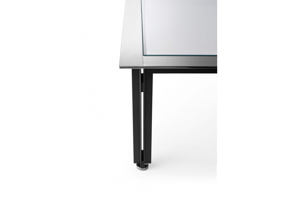 Fasce Cromate designed by Luigi Caccia Dominioni for Azucena is a table with extra light transparent glass top with chromed perimeter bands, steel base with metallic gray finish. Available in three sizes.