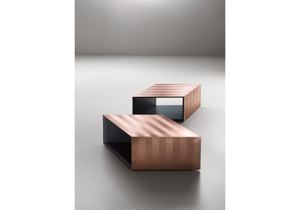 Alpha designed by Martinelli Venezia for DeCastelli is a rhomboid-based coffee table. The simple shape makes it modular: combining it with other identical elements, translated or rotated. The natural copper leather worked with the DeErosion technique creates a diagonal striped pattern that enhances the geometries and emphasizes the graphic effect. Internal structure in lacquered wood.