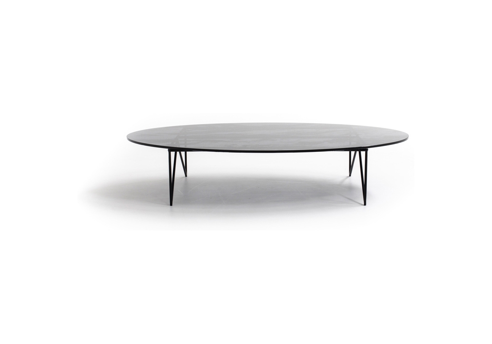 Aerozeppelin designed by Diesel Creative Team for Diesel with Moroso is a coffee table with black smoked glass top with vitrified serigraphy and base in powder coated steel. It is available in different shape and size.