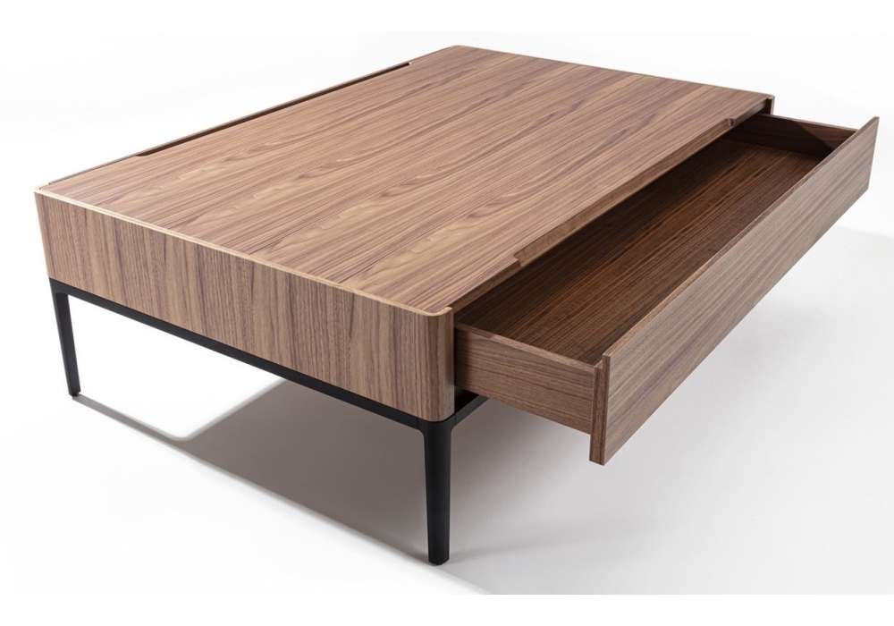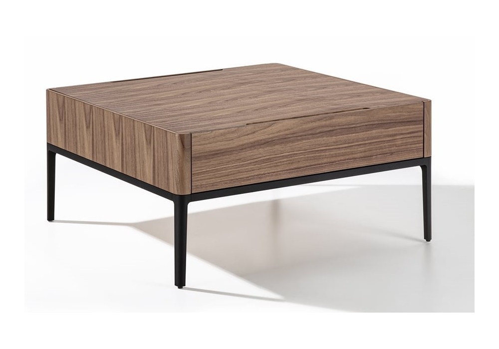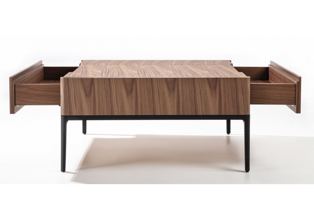Chiba designed by D. Dolcini for Porada is a coffee table with drawers made of Canaletta walnut and structure in matt black painted aluminium.