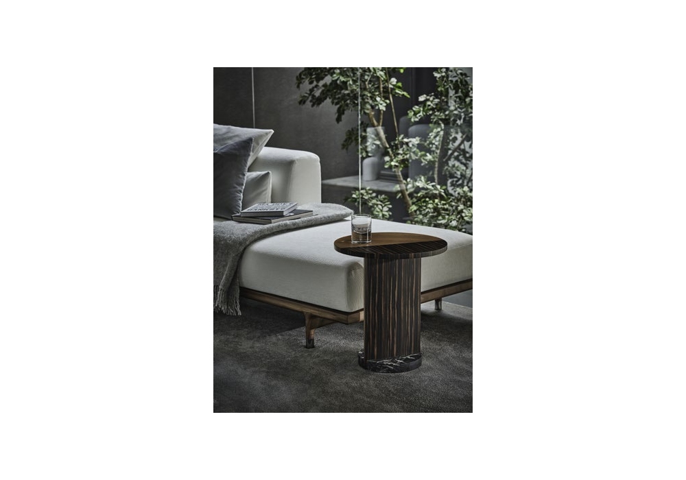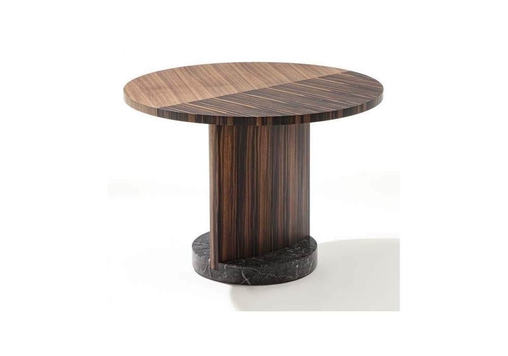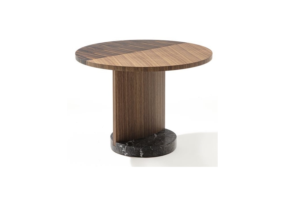 Leaf designed by Patrick Jouin for Porada is a collection of coffee tables in different dimensions made with marble base, central leg and wooden top in the double canaletta walnut and Amara ebony finish.