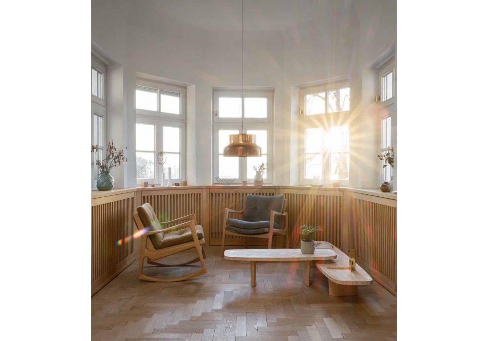 Matéria designed by Christian Haas for ClassiCon is a coffee table made with frame in natural solid maple, with transparent varnish. Top in natural travertine or with indigo-colored indentations. Top support in light ivory lacquered metal. Gliders in black felt. Available in different dimensions.