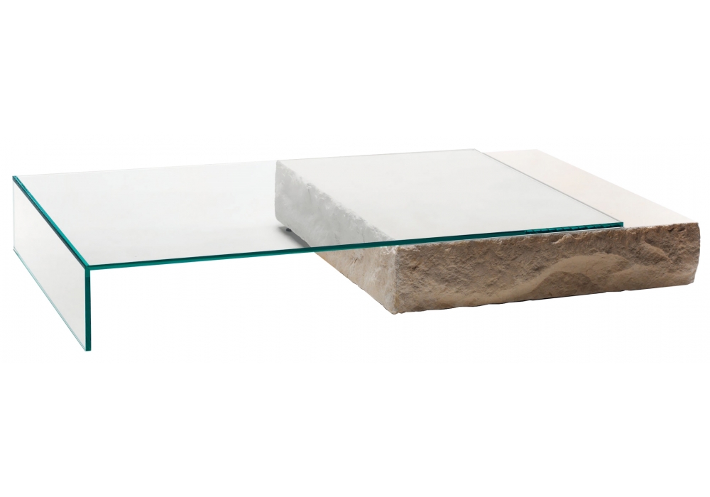 Terraliquida designed by Claudio Silvestrin for Glas Italia is a low table composed of a parallelepiped in Limestone stone with a monolithic appearance and an element in 15 mm extralight transparent glass. tempered, glued at 45 °, which rests on it. The parallelepiped in stone has the sides with a split finish, while the top is flamed.