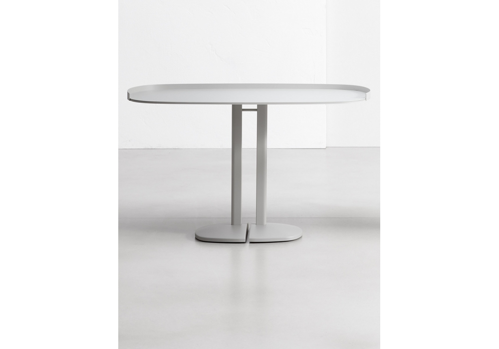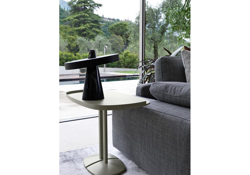Victoria designed by Emanuela Garbin for Flou is a side table with oval shape top and structure in burnished metal. Available in two models: one or two legs. Wooden base coated like the structure.