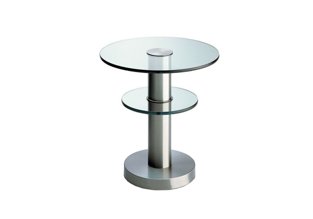 Tavolino 1932 designed by Gio Ponti for Fontana Arte is a side table composed of a cylindrical structure in brushed nickel-plated metal and two shelves in 15 mm thick float glass with a circular shape.