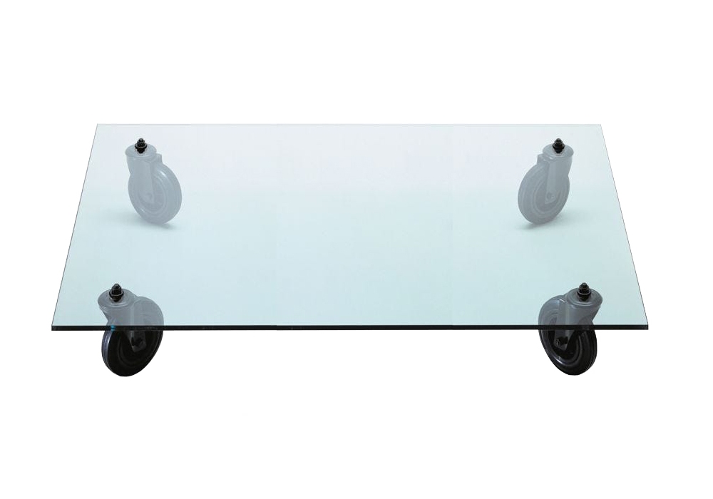 Tavolo con Ruote designed by Gae Aulenti for Fontana Arte is a coffee table made from a 15 mm thick polished float glass plate and industrial wheels with black painted metal forks. Available in different models.