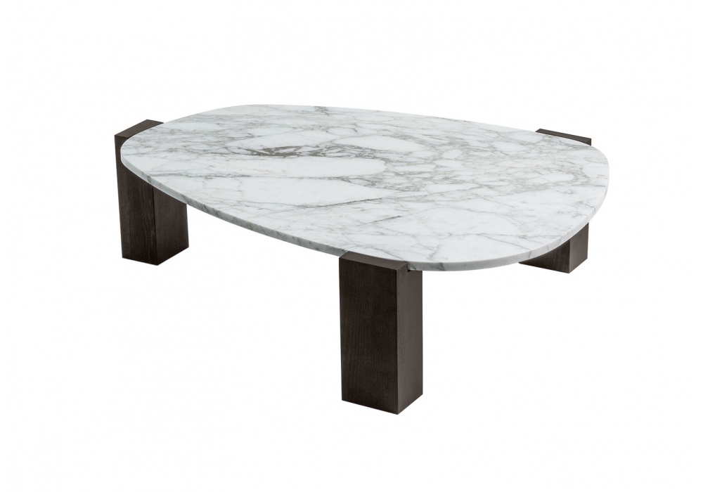 Gogan designed by Patricia Urquiola for Moroso is a coffee table with top in tempered, etched and varnished extra-clear glass or in polished marble. Base in varnished, lamellar ash wood.