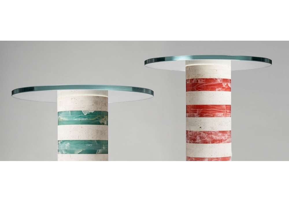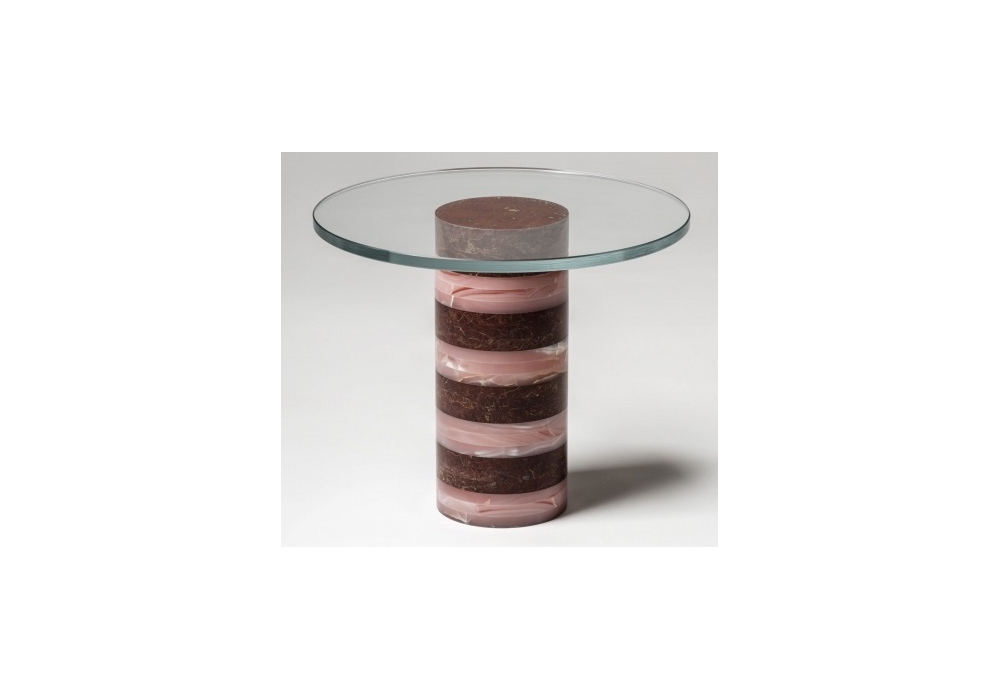 Architexture Side Table designed by Patricia Urquiola for Budri is a side table made with central column in striped marble and top in extra-clear tempered glass. Available in different finishes.