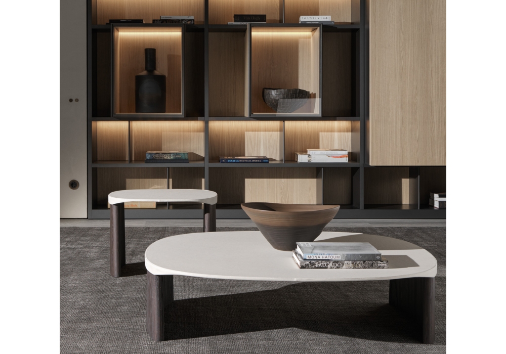 Cleo designed by Vincent Van Duysen for Molteni&C is a series of coffee tables made with a base in solid wood stained with a painted metal connection structure and top in medium density fiber panel with a new metallic finish (Galaxy), or upholstered in Eco -Skin.