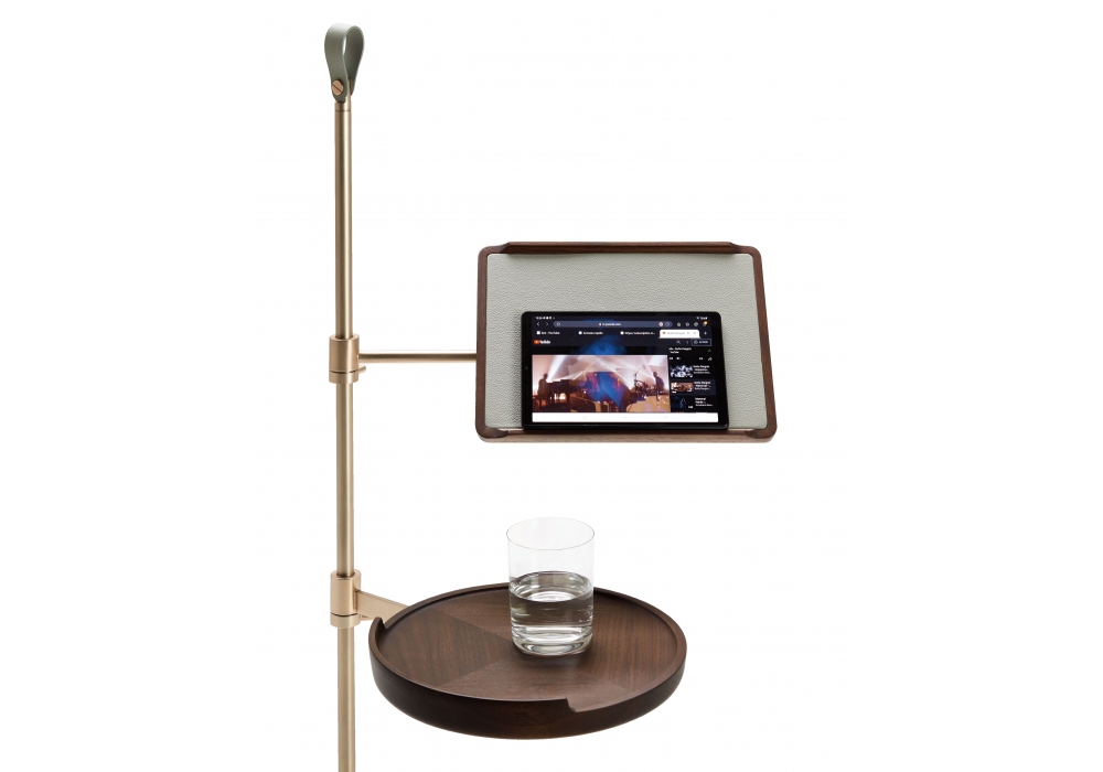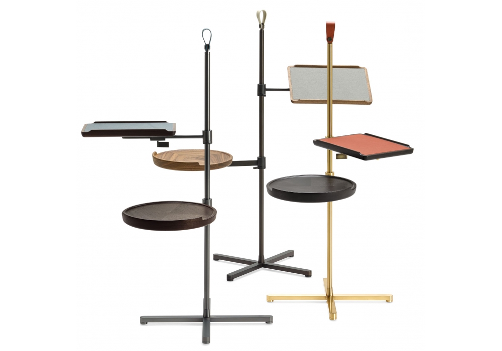 Galimede designed by Giuseppe Casarosa for Ceccotti Collezioni is a side table with steel structure, solid american walnut tops, and readering top with leather cover.