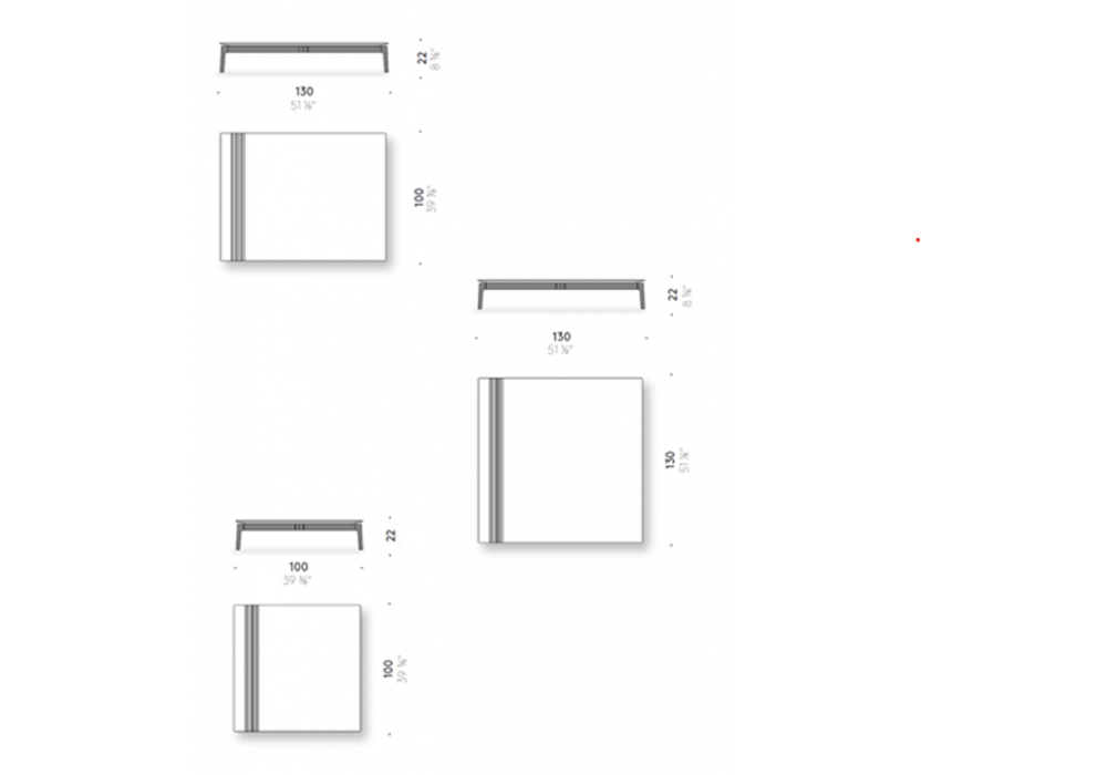 | Dimensions | - 100 x 100 x H 22 cm; -130 x 130 x H 22 cm; - 130 x 100 x H 22 cm. |