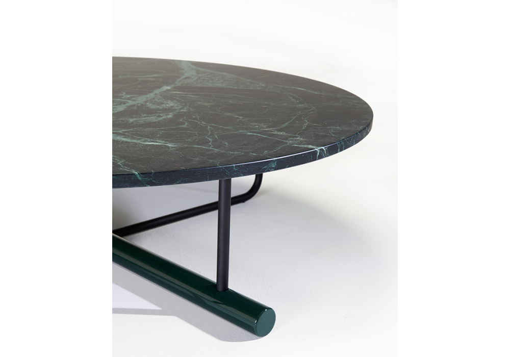 628 ToTo designed by Bertrand Lejoly for Zanotta is a coffee table with structure in matt black painted steel. Top in steel sheet covered with pigmented leather in combination with the foot in glossy black lacquered beech, or tops in white Carrara or green Alpi marble in combination respectively with the foot in glossy white RAL 9010 or glossy green RAL 6012 lacquered beech.