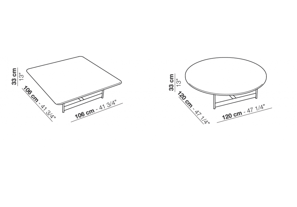 | Dimensions | 106 x 106 x H 33 cm; Ø 120 x H 33 cm. |