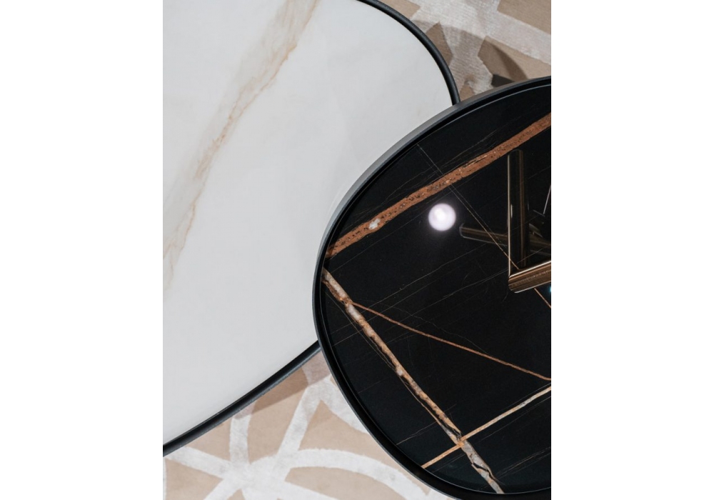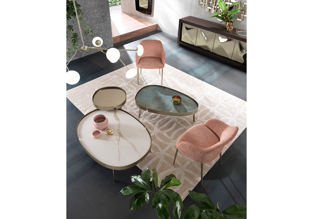Lumiere designed by Riflessi is a coffee table with painted metal structure, crystal or ceramic top and frame spacer made of rose gold painted metal. Available in different dimensions and finishes.