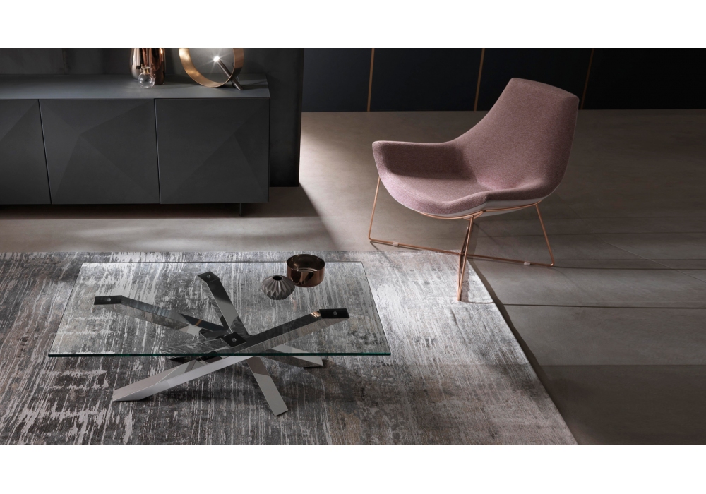 Shangai designed by Riflessi is a coffee table with structure in painted metal, mirroring stainless steel or wood and top in crystal or ceramic. Legs inclined and overlapping asymmetrically with central joint. Available in different finishes.
