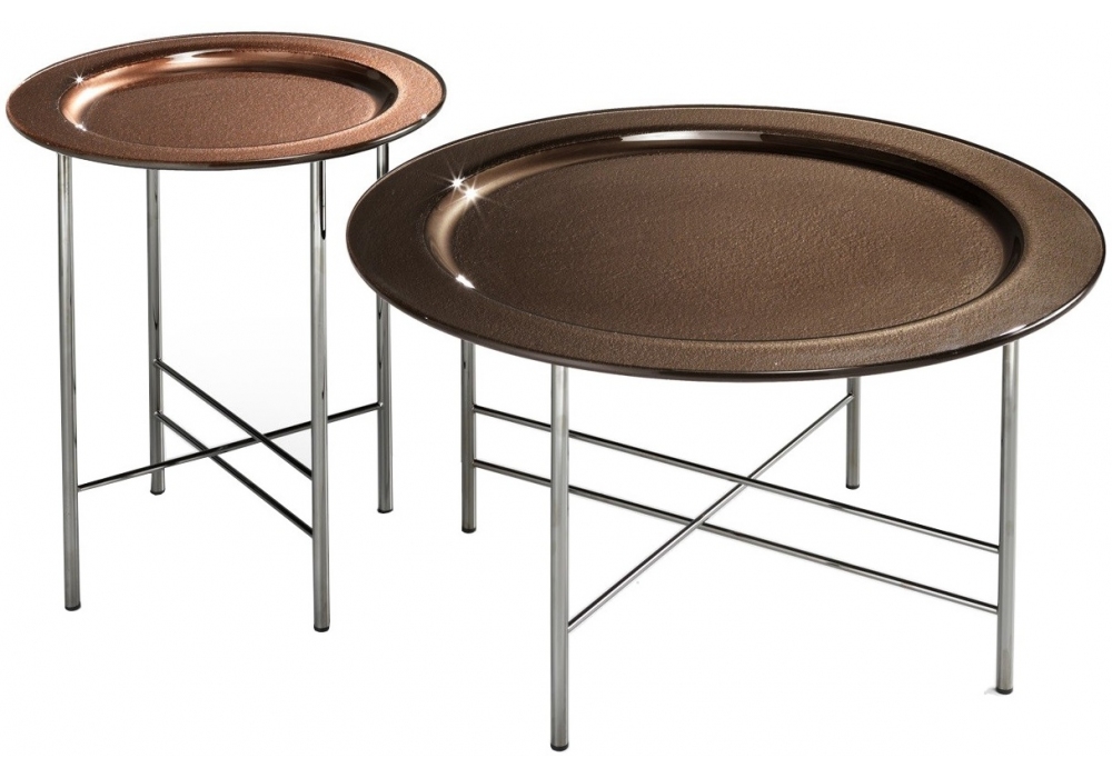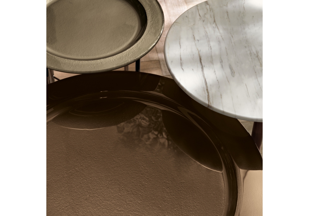 En designed by Setsu & Shinobu Ito for Foam is a table with top in fused glass, back-lacquered with metallic paints. Base in black glossy nickel painted metal. Available in several dimensions.