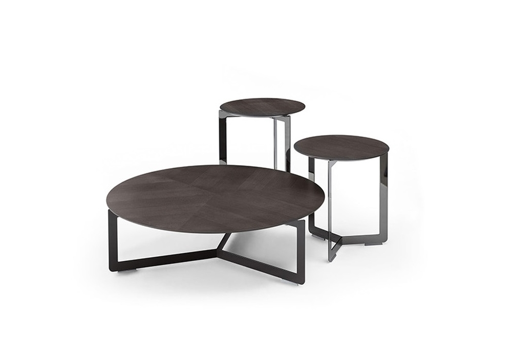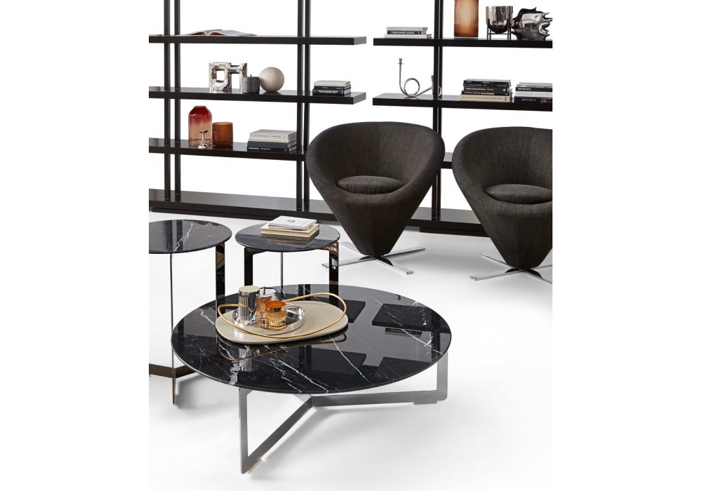 Malibù designed by Carlo Bimbi for Dema is a side table made with laser-cut metal structure complete with non-slip in molded thermoplastic material and top in marble, leather or veneered wood. Available in different finishes and dimensions.