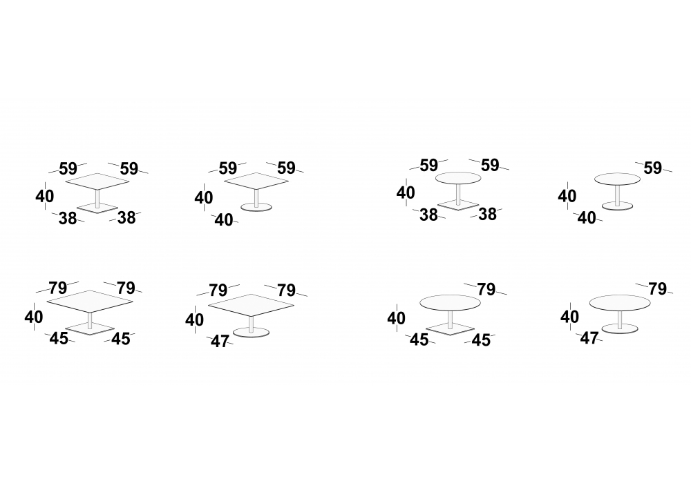 | Dimensions | - 59 x 59 x H 40 cm; - 79 x 79 x H 40 cm; - Ø 59 x H 40 cm; - Ø 79 x H 40 cm. |