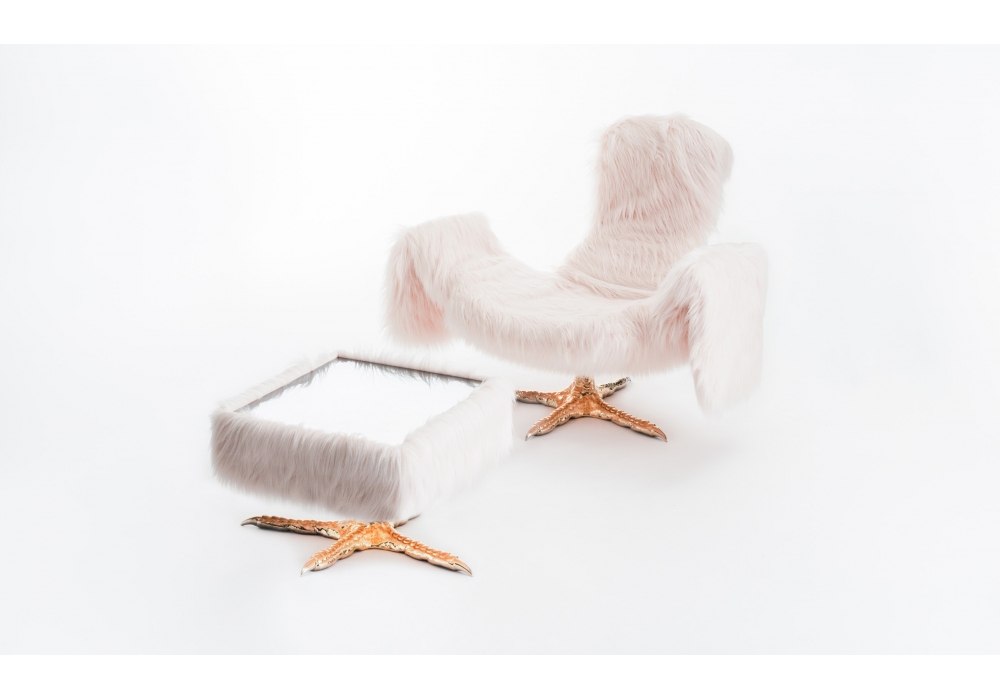 Cocky designed by Sfera Ebbasta for Driade is a coffee table with thick top with mirror stainless steel top and edge covered in long-haired eco-fur, base in shiny gold painted aluminum.