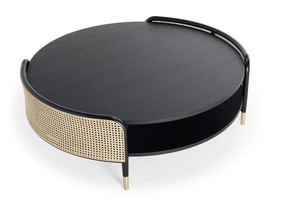 Detour designed by Gamfratesi for Gebrüder Thonet Vienna is a coffee table with curved beech structure, ash shelves and Vienna straw inserts. Brass tips.