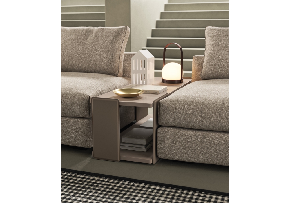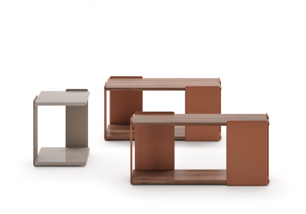 Frank designed by Enrico Cesana for Marac is a side table with metal base covered in leather in Caramel, Graphite and Tortora colors. Tops veneered with Canaletto walnut or oak, natural finish, or lacquered with matte or glossy finish in the colors from the samples. Available in different sizes.