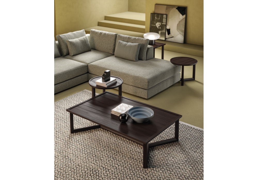 Jo-Jo designed by Marac Lab for Marac is a coffee table with base and top in ash wood, natural or mocha, walnut or "smoky" stained finish. Available in different sizes.