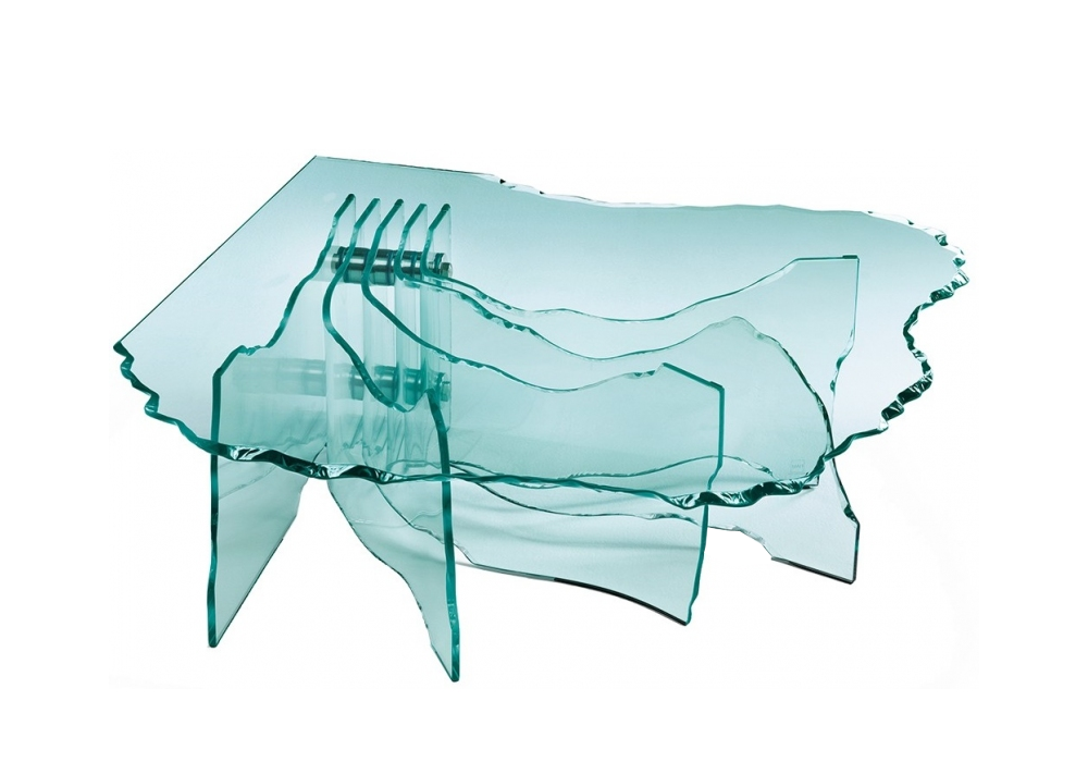 Shell designed by Danny Lane by Fiam is a coffee table with 12 mm-thick curved glass base and 15 mm-thick hand sculptured glass top. Metal parts in stainless steel.