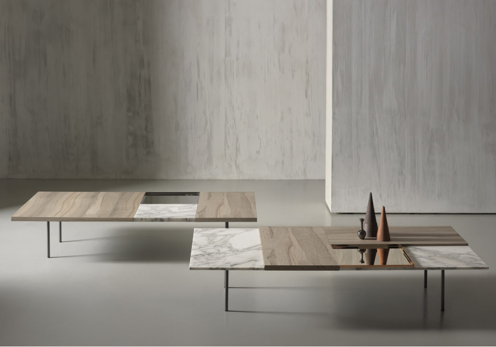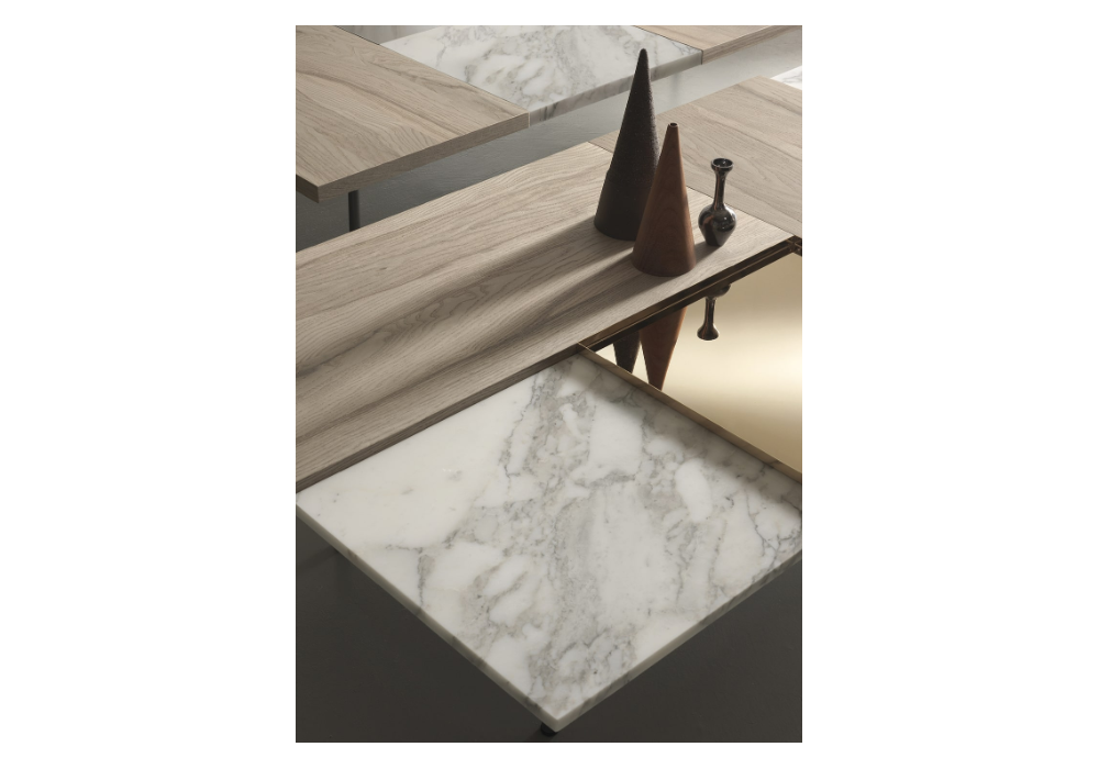 Moodboard designed by Massimo Mariani for Acerbis is a coffee table with base in epoxy powder coated steel in micaceous gray finish, top in wood, dark stained walnut or swamp ash 30mm thick, or in marble, matt white guilloche or matt graphite 15mm thick. Tray in polished steel or polished brass-plated steel. Available in various sizes.
