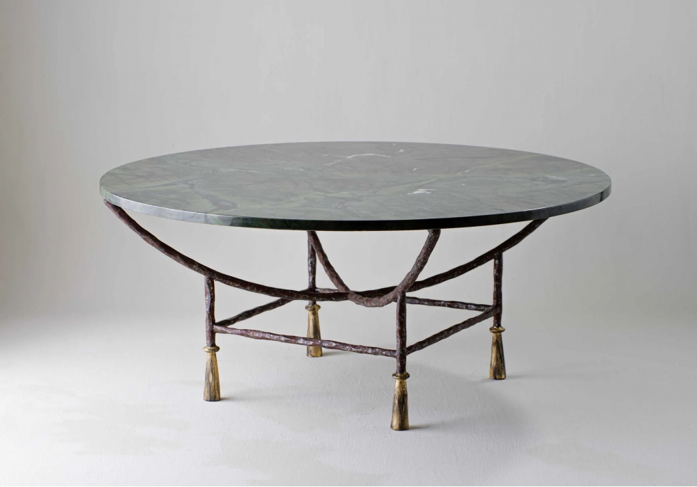 Stanley designed and produced by Porta Romana is a circular coffee table with forged steel structure painted in different colours. The top is in tempered glass or marble in different finishes.