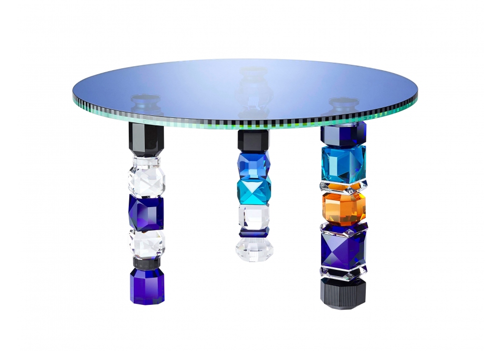 Detroit produced and designed by Reflections Copenhagen is a circular crystal table structured by various geometric elements carved and finished by hand painted in multicolour.