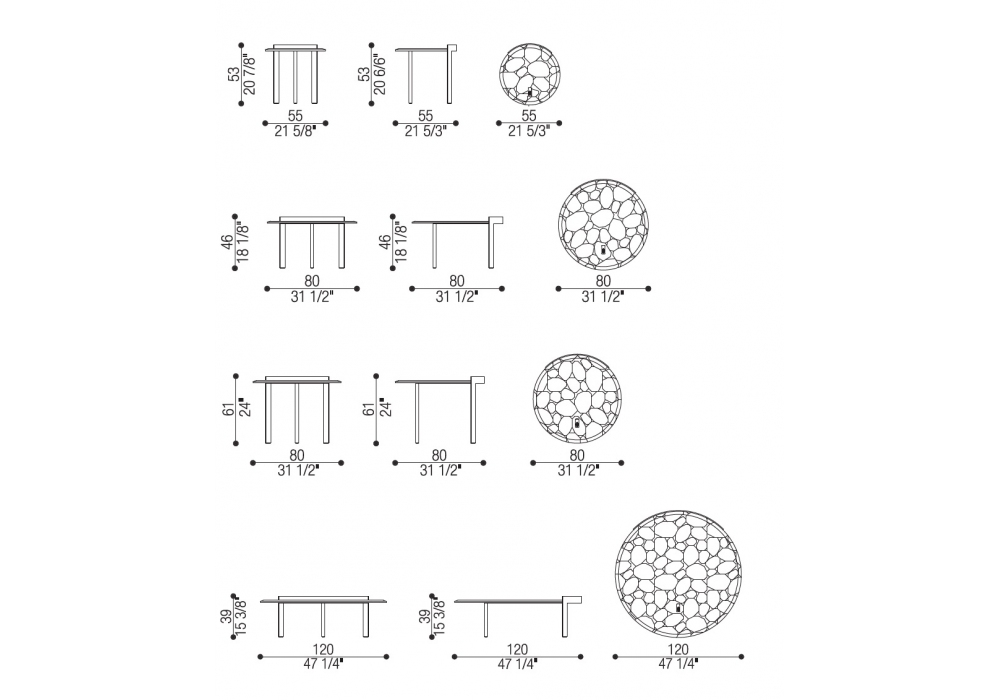 | Dimensions | Ø 55 x H 53 cm; Ø 80 x H 46 cm; Ø 80 x H 61 cm; Ø 120 x H 39 cm. |
