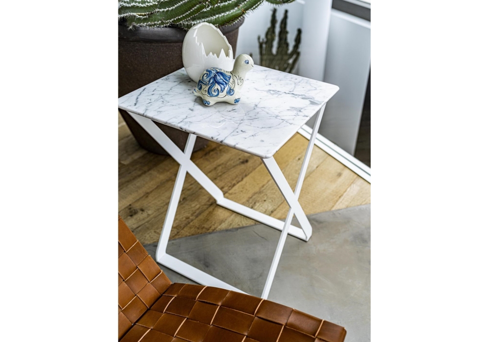 Crossover designed by RedCreative for Enrico Pellizzoni is a side table with X-shaped structure in lasered steel. Marble top 20mm thick, shaped and bevelled. Available in different finishes.