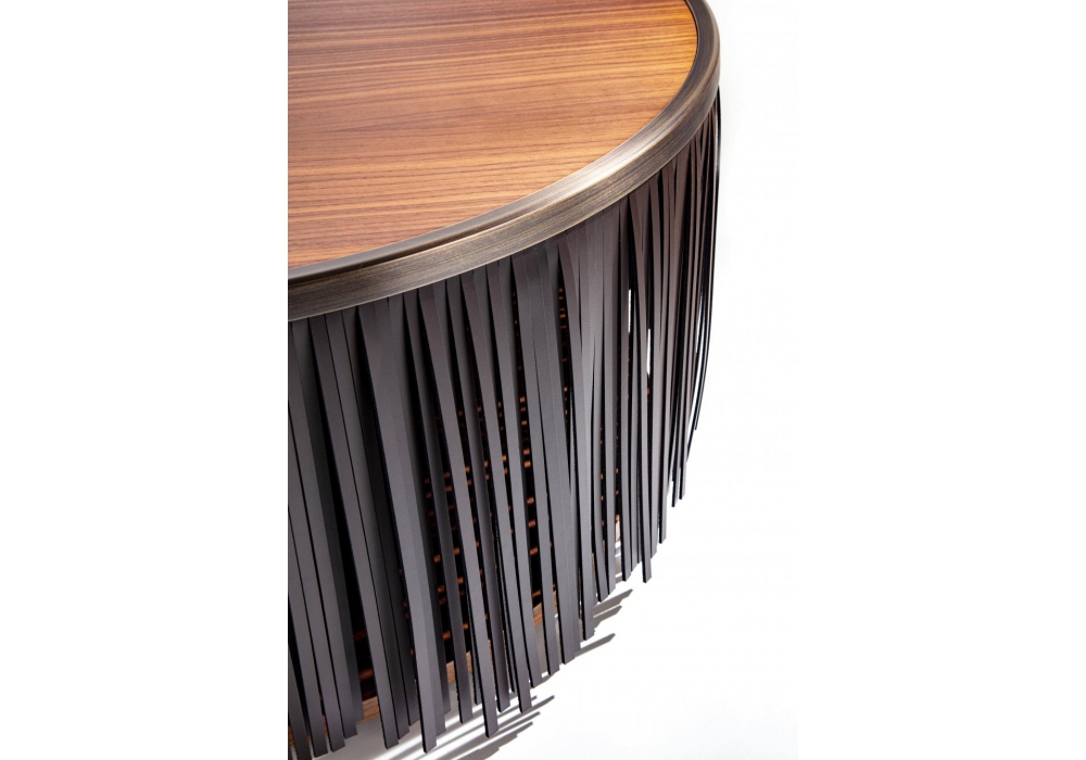 Indian 80 designed by Studio Nove.3 for Enrico Pellizzoni is a coffee table with wooden top and base, leather covering and brass frame. Possibility of adding a LED panel with sensor for internal lighting and/or a wireless charger in the support surface.