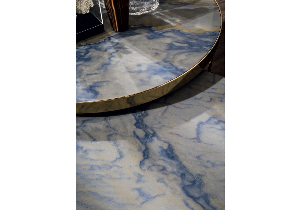 Bis designed by AL1 for Longhi is a coffee table with laser cut ground metal structure with glossy or matt finish and top in mirror, onyx or marble. Available in different dimensions.