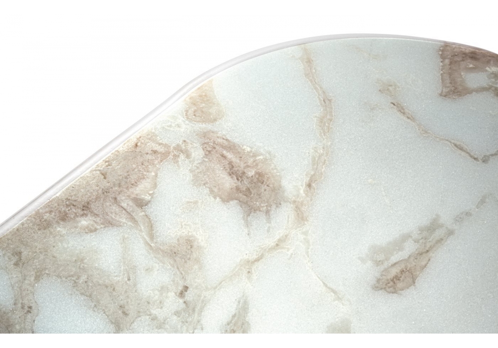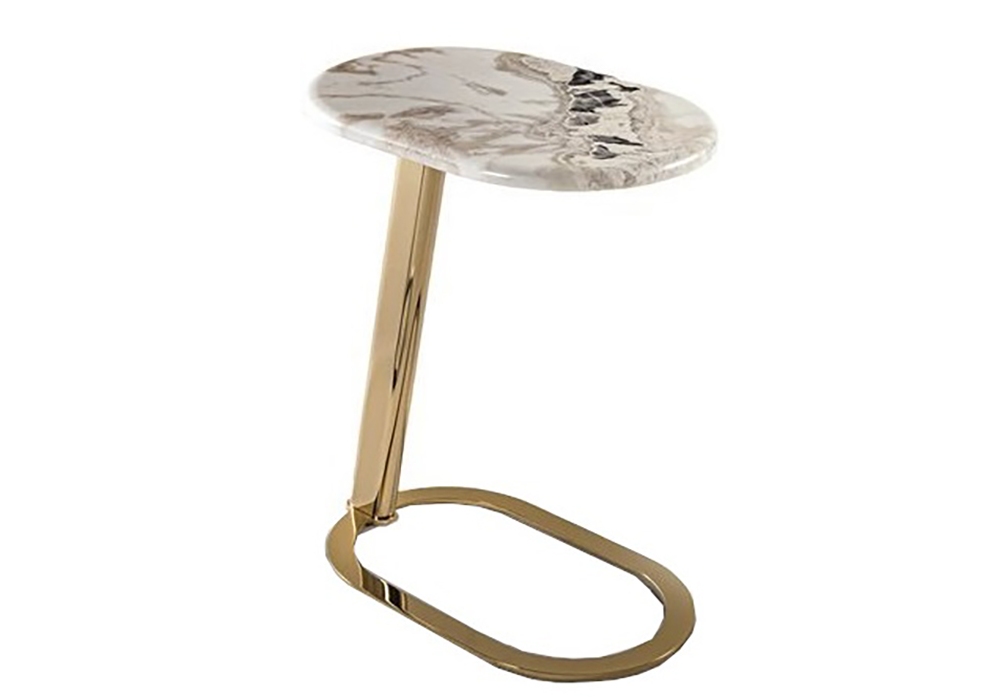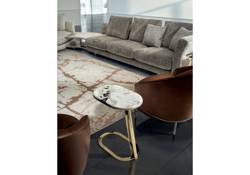 Kobe designed by Giuseppe Iasparra for Longhi is a side table with laser cut metal structure in glossy or matt finish and top in marble or shaped in Macadamia stained Canaletto Walnut.