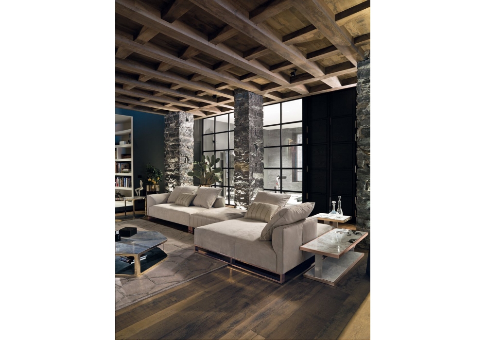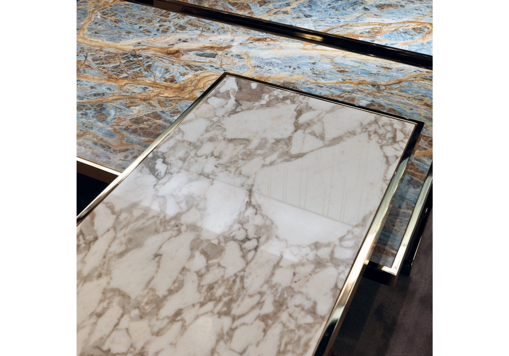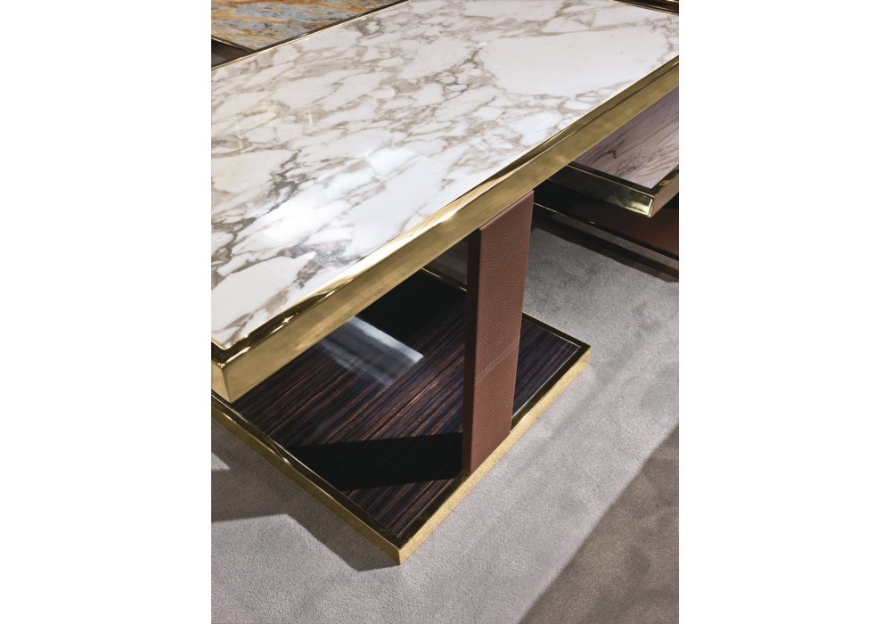 Layer designed by Giuseppe ViganĂ² for Longhi is a coffee table with metal structure, top in marble or onyx and lower top in wood or covered in leather - Columns in leather or on request in the same color as the structure. Available in different dimensions.