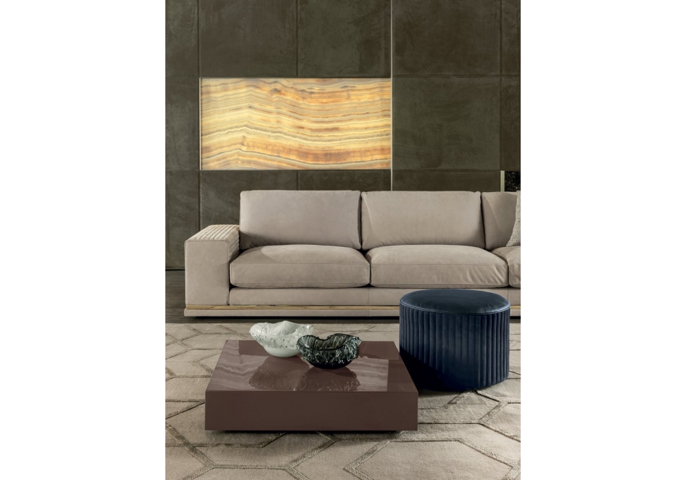 Safir designed by Elle Studio for Longhi is a coffee table with leather covering. It is possible to insert a backlit light point in the top. On request available with wooden structure in veneer or glossy lacquer. Available in different dimensions.