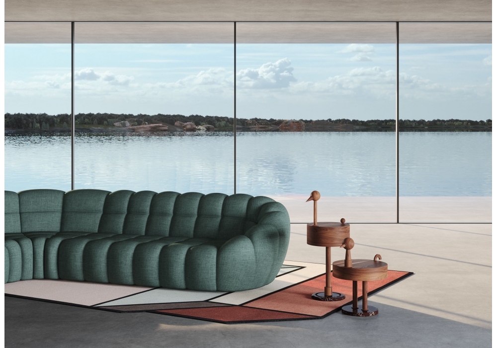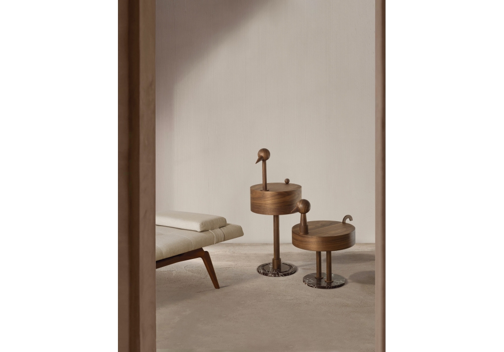 Rara Avis designed by Andrés Martinez for Nomon is a side table with structure in natural walnut and base in Rosso Levanto marble. Available in 2 sizes.