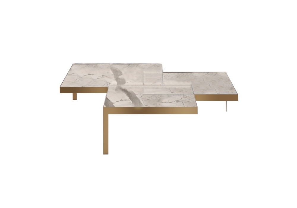 John designed by Sebastiano Zilio for Kreoo is a coffee table with marble top formed by three square elements with different sizes that intersect each other. Metal structure.