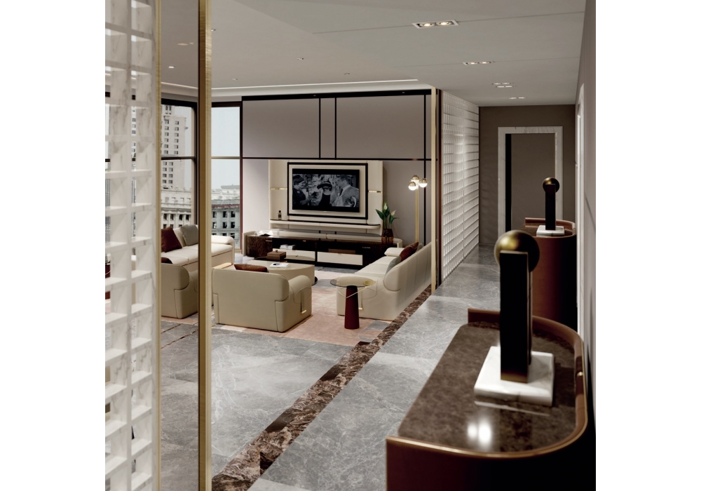 Eclipse designed by Andrea Bonini for Turri is a side table with base in MDF and plywood in different hand-decorated glossy polyester finishes and leather upholstery. The top is in bronzed glass and is supported by a metal element in a light gold finish.