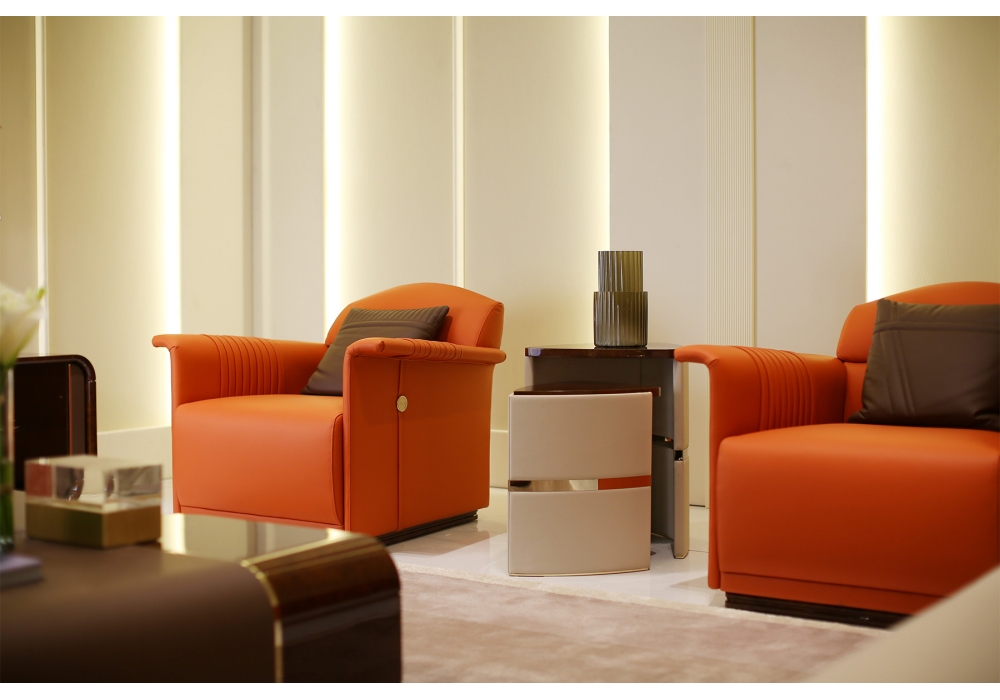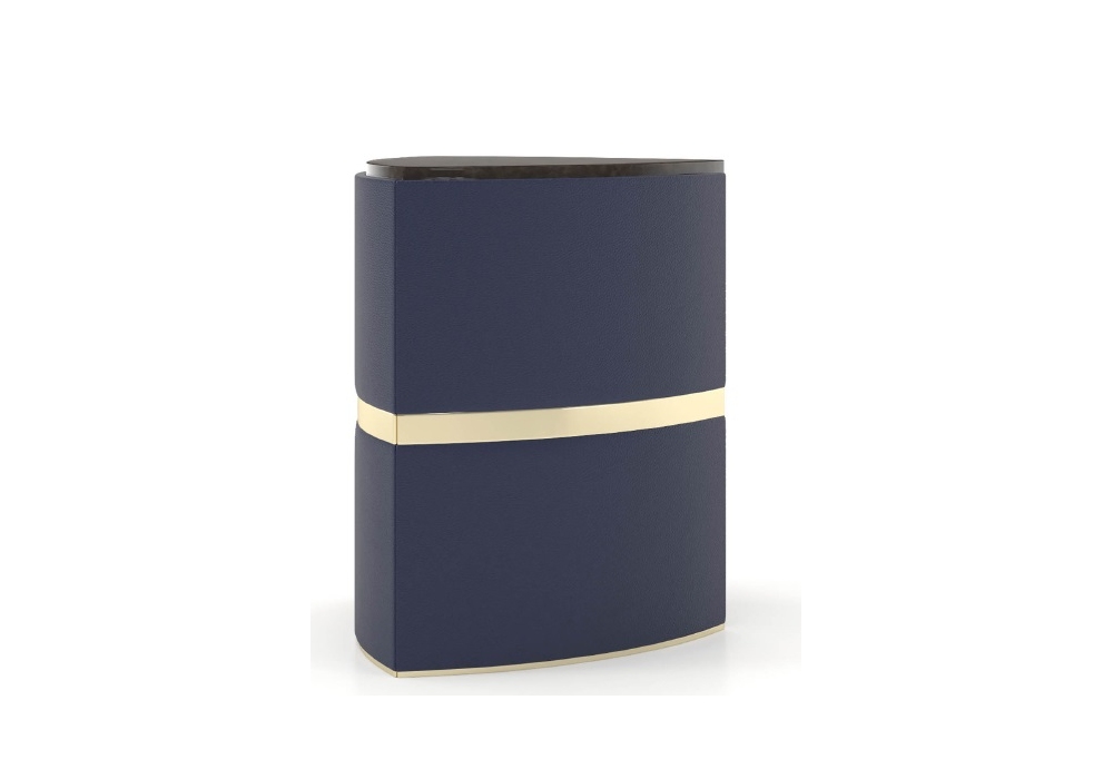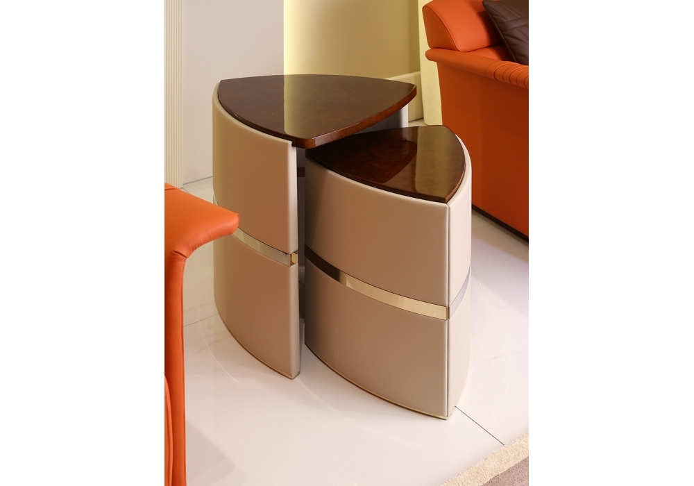 Madison designed by Andrea Bonini for Turri is a side table with structure and top in MDF and particle board panels with hand-decorated glossy polyester finish. Structure upholstery in different leathers with light gold metal details.