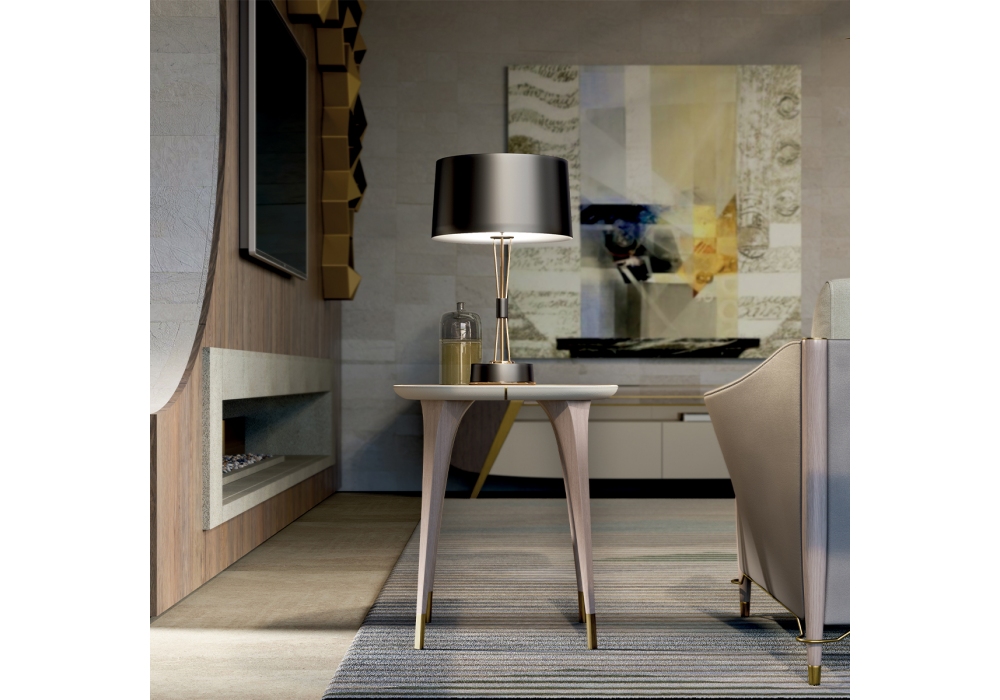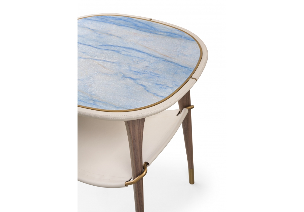 Melting Light designed by Andrea Bonini for Turri is a side table with structure in MDF and solid walnut. Top in marble or wood in different finishes with leather covering. Metal parts in brushed gold or bronze finish. Available in the version with or without pocket.