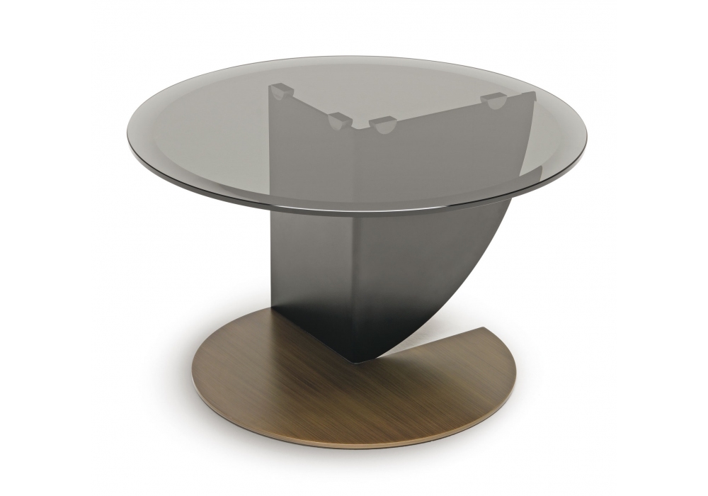 Rialto designed by MisuraEmme is a coffee table with structure made up of metal circles and semi-circles, characterized by having the base in an antiqued brass painted and black painted finish. The glass top can be 100% full circle or 3/4 circle.