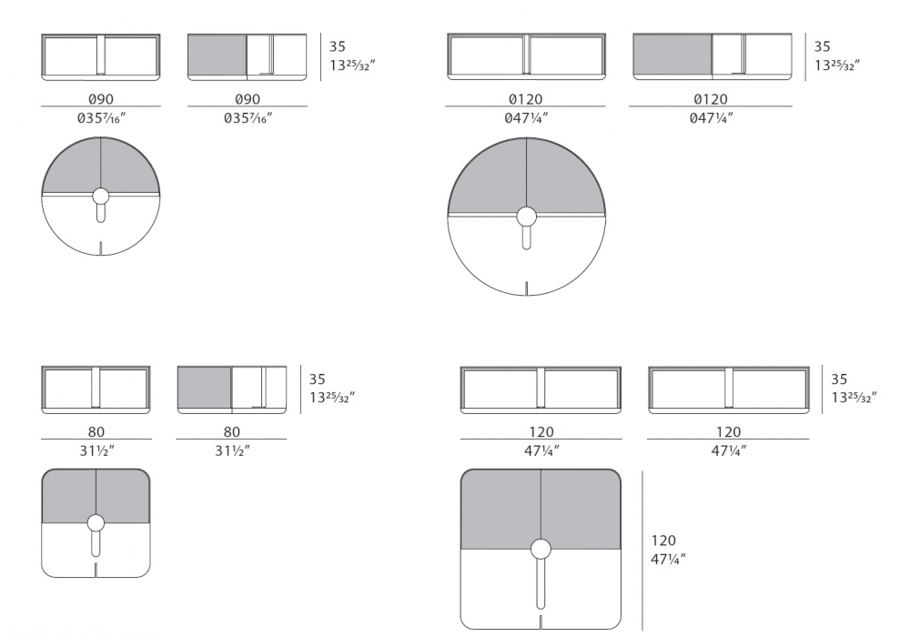 | Dimensions | Ø 90 x H 35 cm; Ø 120 x H 35 cm; 80 x 80 x H 35 cm; 120 x 120 x H 35 cm. |