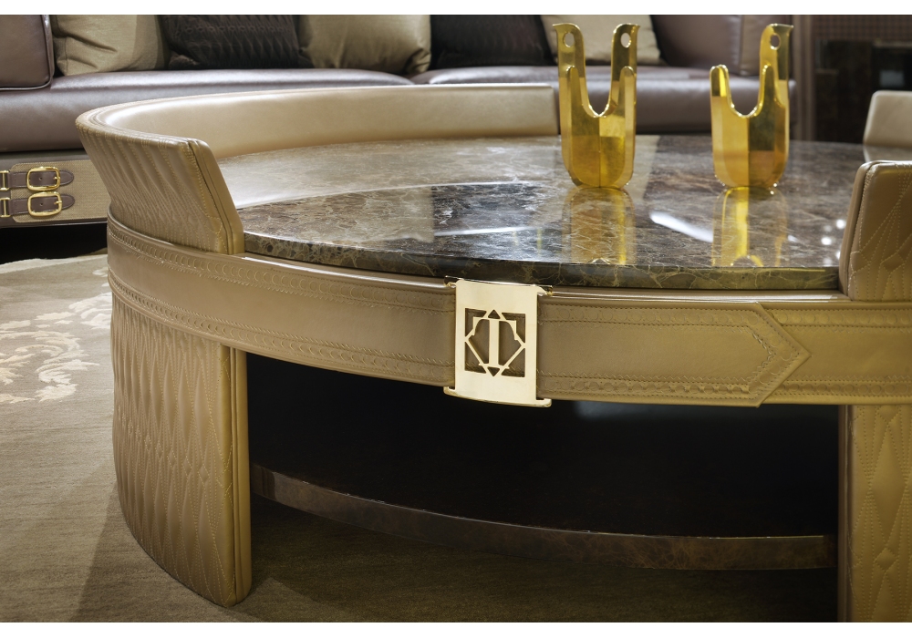 Numero Tre designed by Roberto Serio for Turri is a round coffee table with structure in MDF, solid wood, plywood and particle board panels with hand-decorated glossy polyester finish. Upholstery in embroidered leather and top in marble or wood.