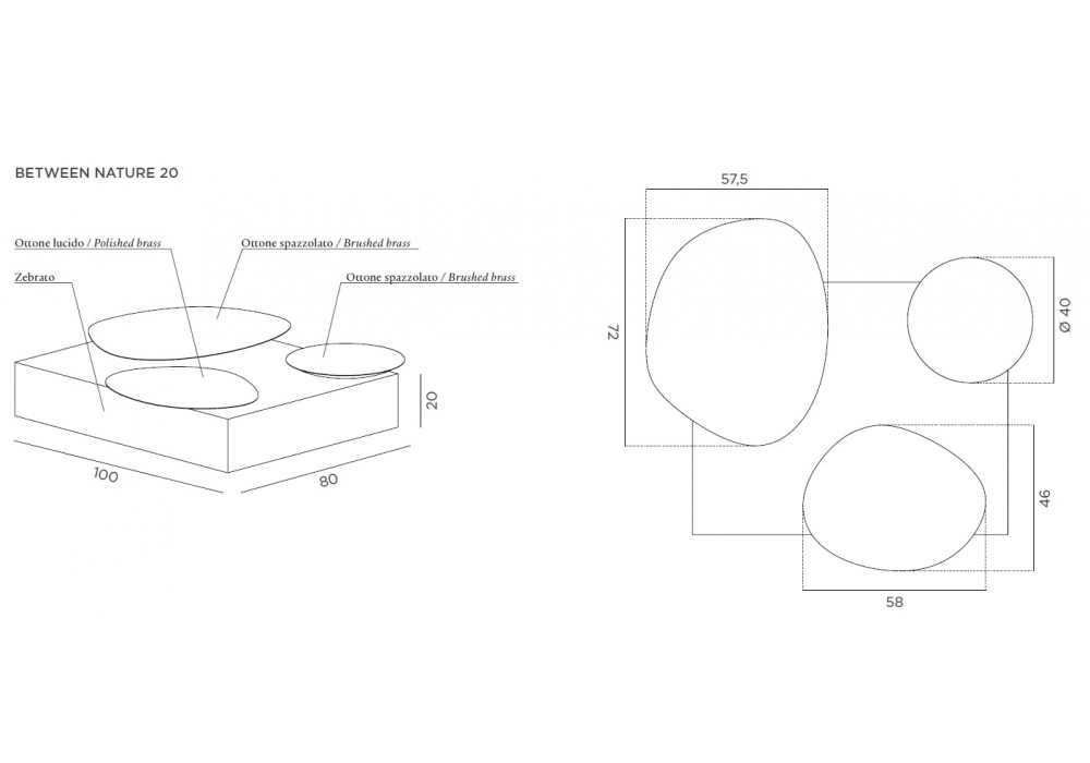 Between Nature designed by Stormo Studio for DeCastelli is a coffee table featuring a base in eroded “Zebrato” marble, metal trays of various shapes in a brass finish.